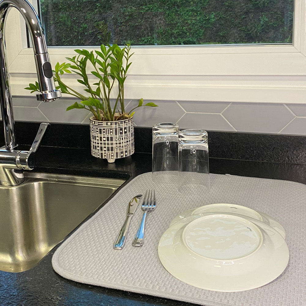 No lugar do escorredor tradicional, um aparador moderno, macio ao toque e com cara de cozinha bem cuidada: o aparador de louça de microfibra com super absorção cinza da Casa da Toalha.