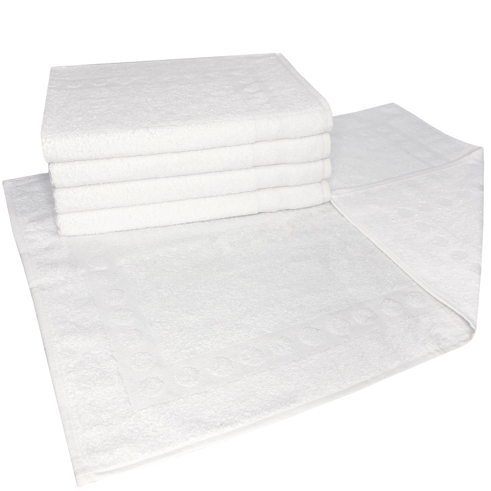 5 toalhas de piso na cor branca, com base antiderrapante.