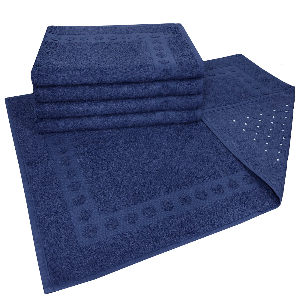 O jogo com 5 toalhas de piso com antiderrapante pisos azul é produzido em algodão 24/2, fio conhecido pela ótima absorção e toque confortável.