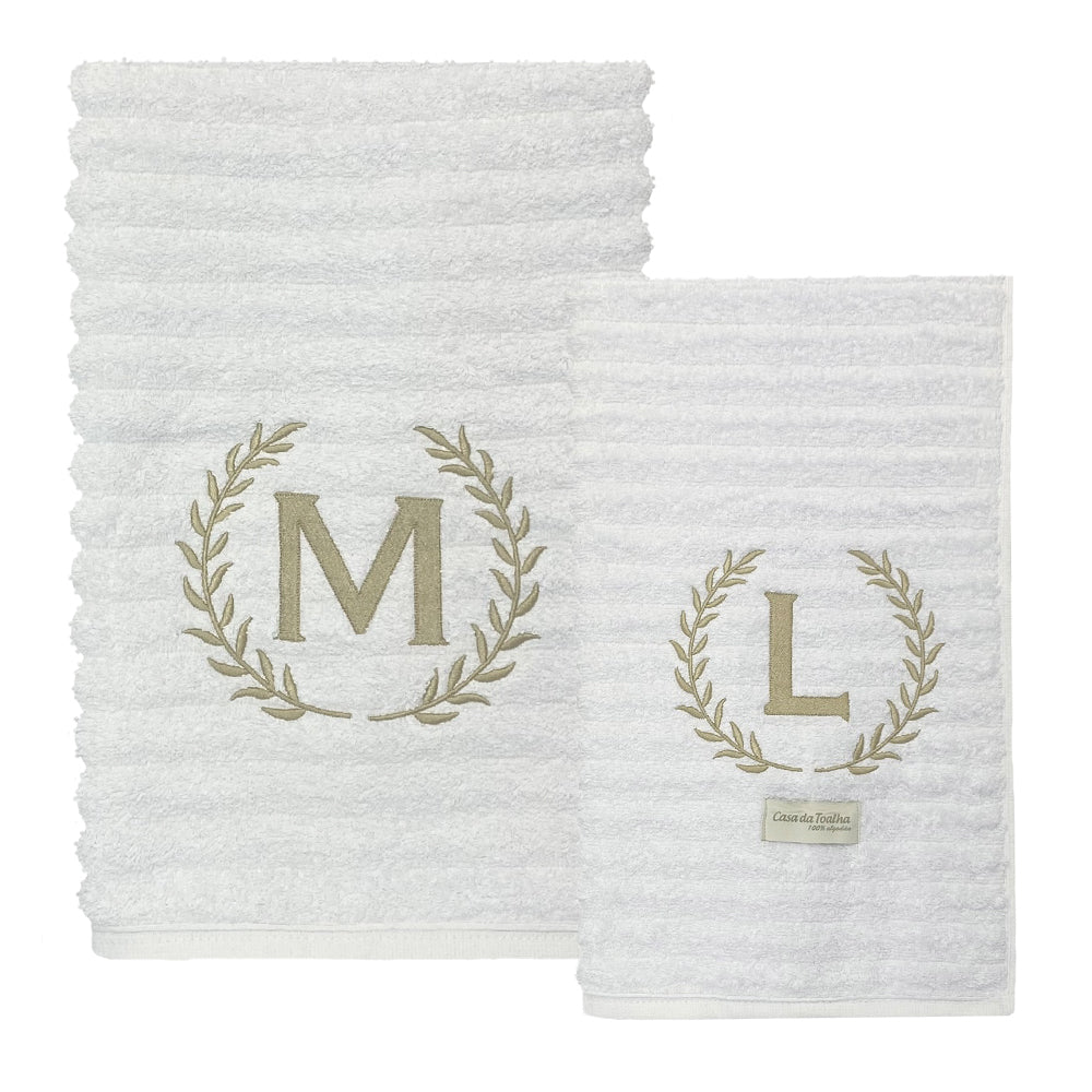 O monograma bordado dá um ar personalizado e refinado ao jogo. A letra ganha destaque na toalha branca, criando um visual limpo, chique e atemporal, que combina com qualquer estilo de banheiro.