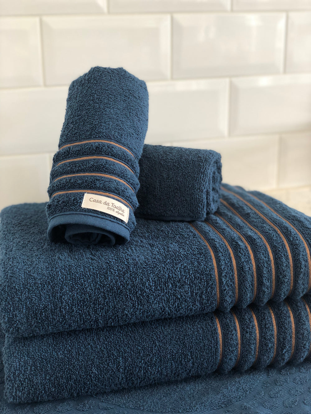 Cada toalha do jogo de toalha 5 peças 100% algodão gramatura 500 coleção Essence azul mede cerca de 1,50 m de comprimento por 72 cm de largura. Esse tamanho geralmente atende bem quem busca toalha de banho ampla, com boa cobertura do corpo e conforto ao se enrolar após o banho.
