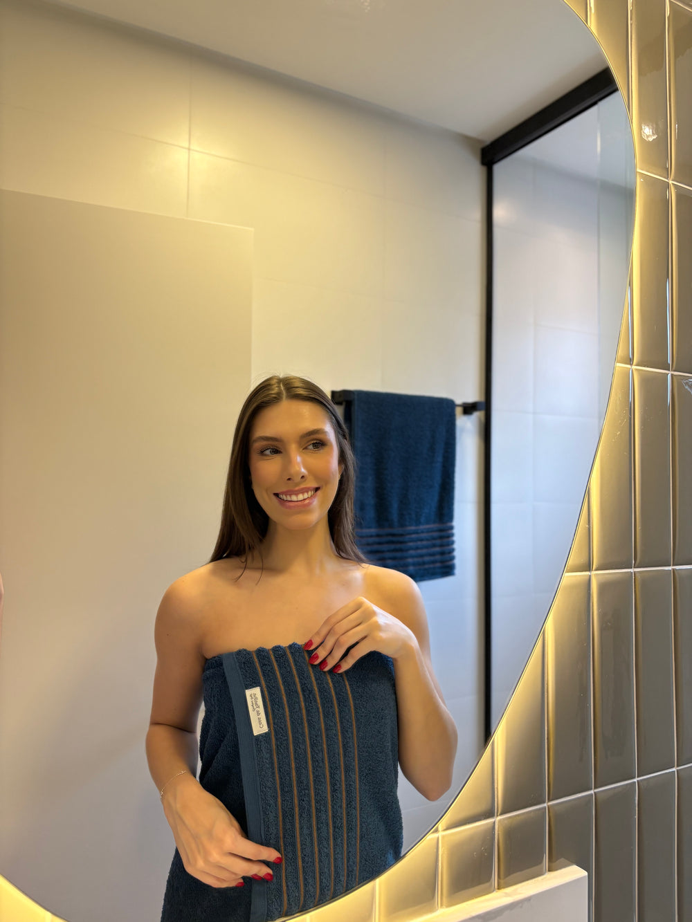 O tom de azul traz elegância imediata ao banheiro, o corpo fica bem seco em poucos instantes e a experiência de pós-banho ganha um ar de cuidado e bem-estar diário, tanto para você quanto para toda a família.