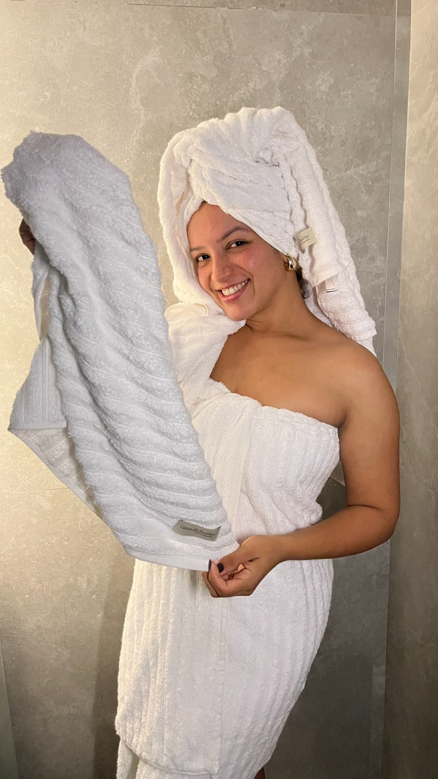 Você termina o banho, a água quente ainda escorrendo, e encontra uma toalha branca volumosa, macia de verdade, que seca o corpo inteiro em poucos movimentos.