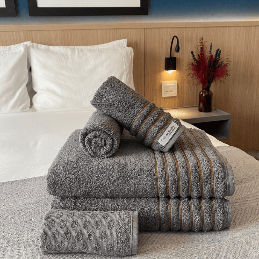 Imagine sair do chuveiro e envolver o corpo em uma toalha volumosa, macia e bem encorpada, enquanto o rosto e os pés também recebem a mesma sensação de aconchego.