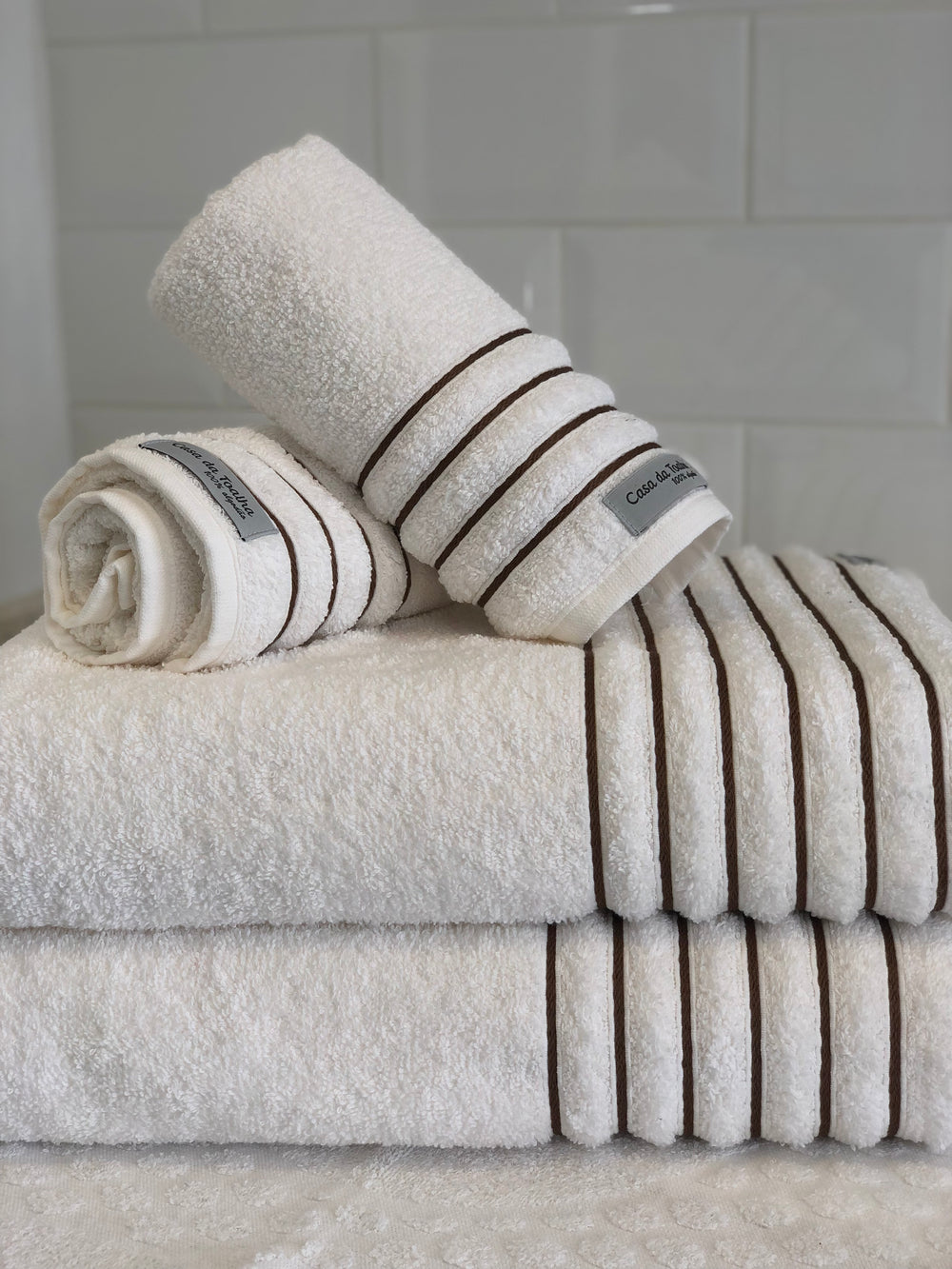 O jogo completo transforma o banheiro em um espaço mais elegante e organizado. As toalhas combinam entre si, o off white traz um visual limpo e sofisticado, o piso dá segurança ao sair do box e as toalhas de rosto completam o conjunto.