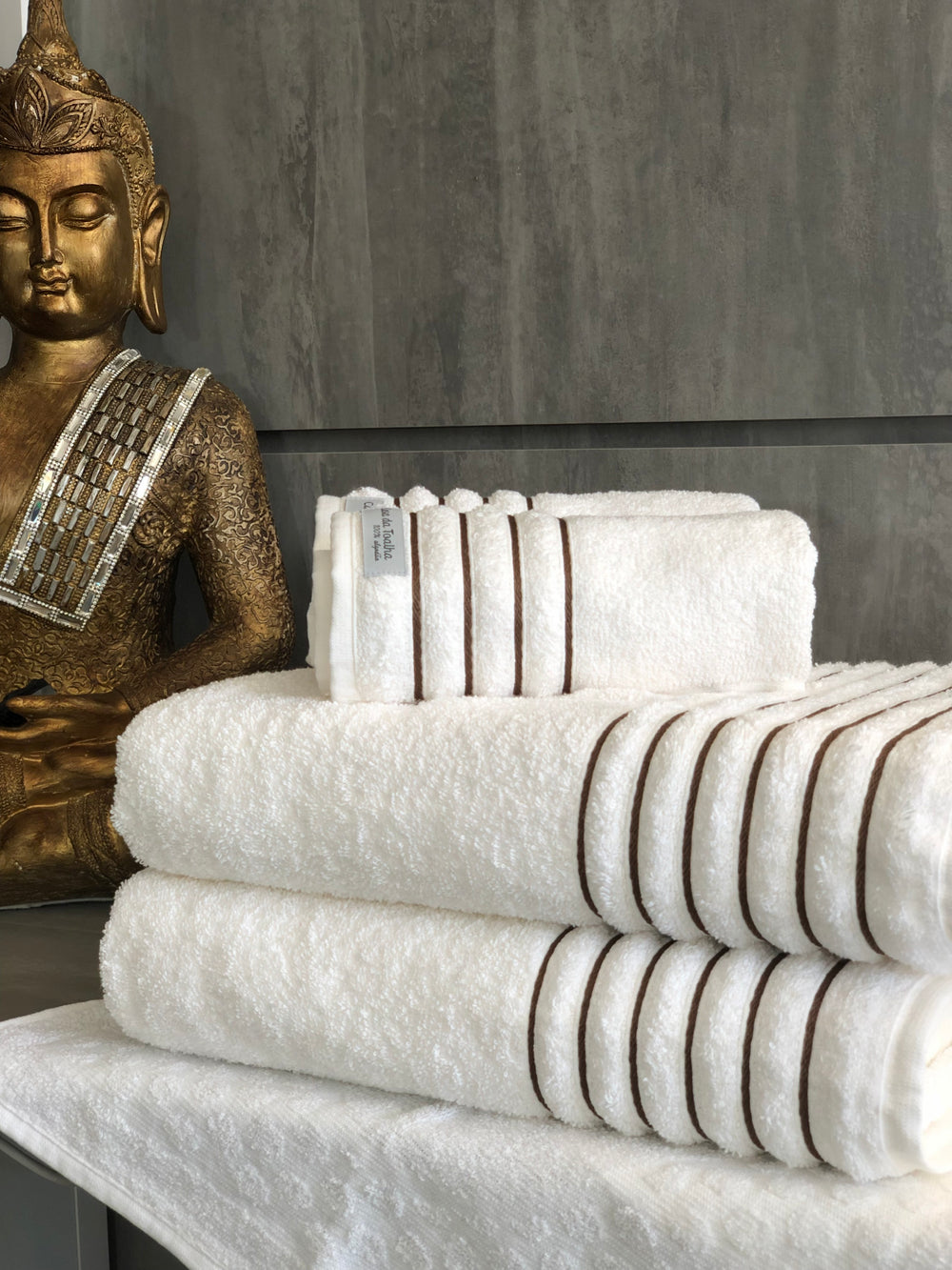 O detalhe em relevo e o desenho na barra trazem elegância sem exagero. O jogo fica bonito tanto dobrado em prateleiras quanto pendurado em suportes e cabideiros.