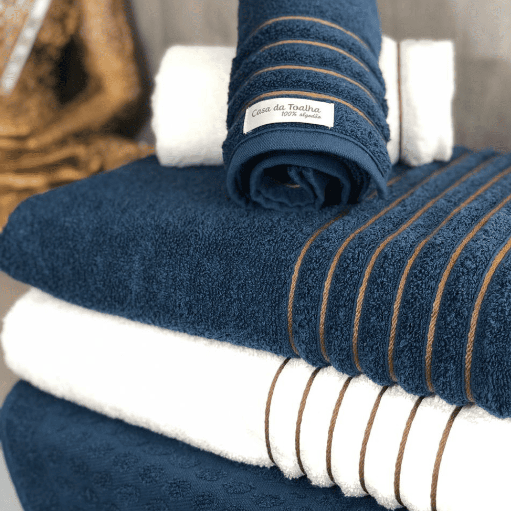Esse é o clima que a toalha de banho gigante gramatura 500 fio penteado jogo com 2 banho 2 rosto 1 piso azul e branca leva para o seu banheiro: conforto intenso, visual elegante e uma experiência de pós-banho que lembra um spa particular.