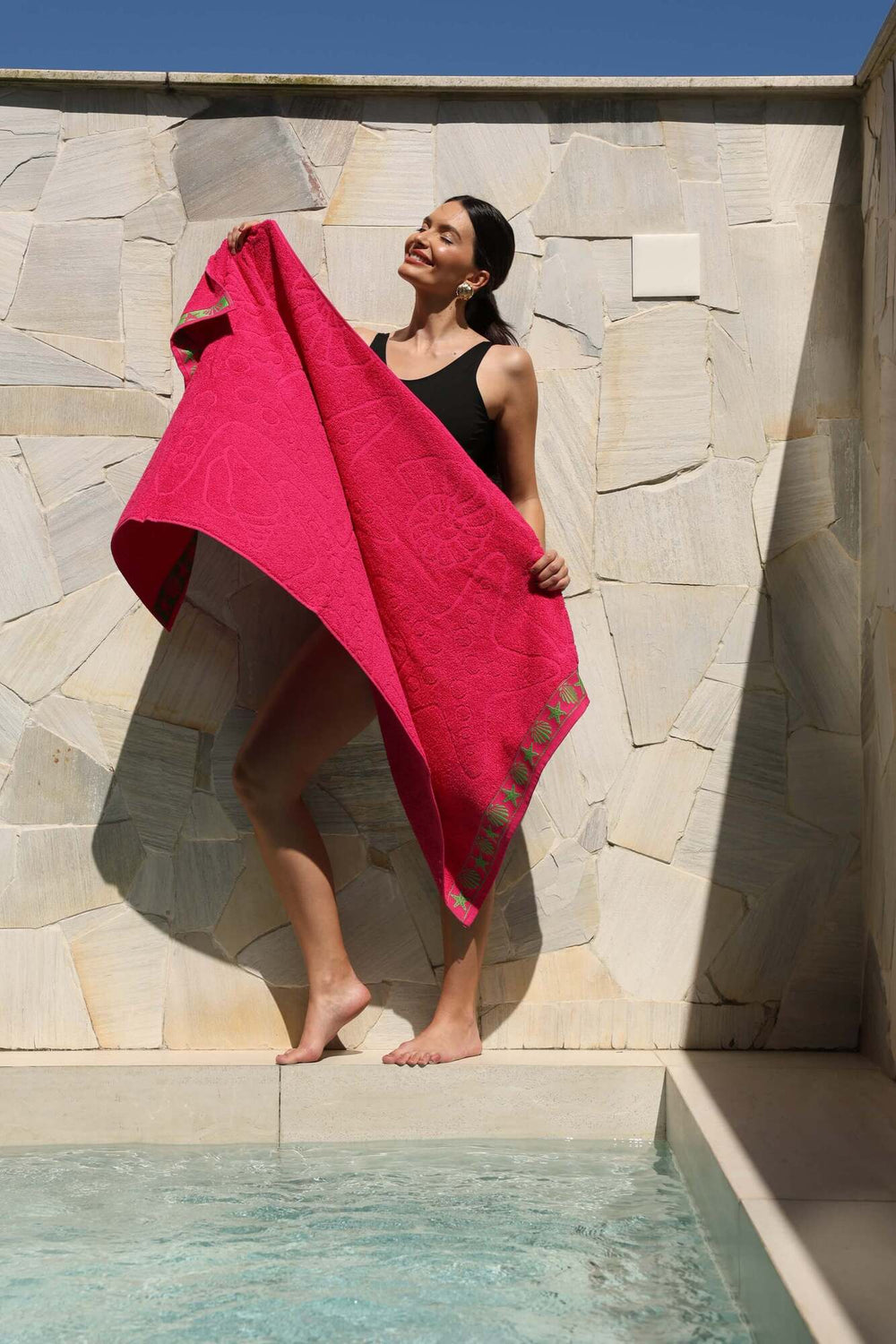 A toalha de praia gigante rosa da Casa da Toalha une beleza e desempenho em uma peça única.